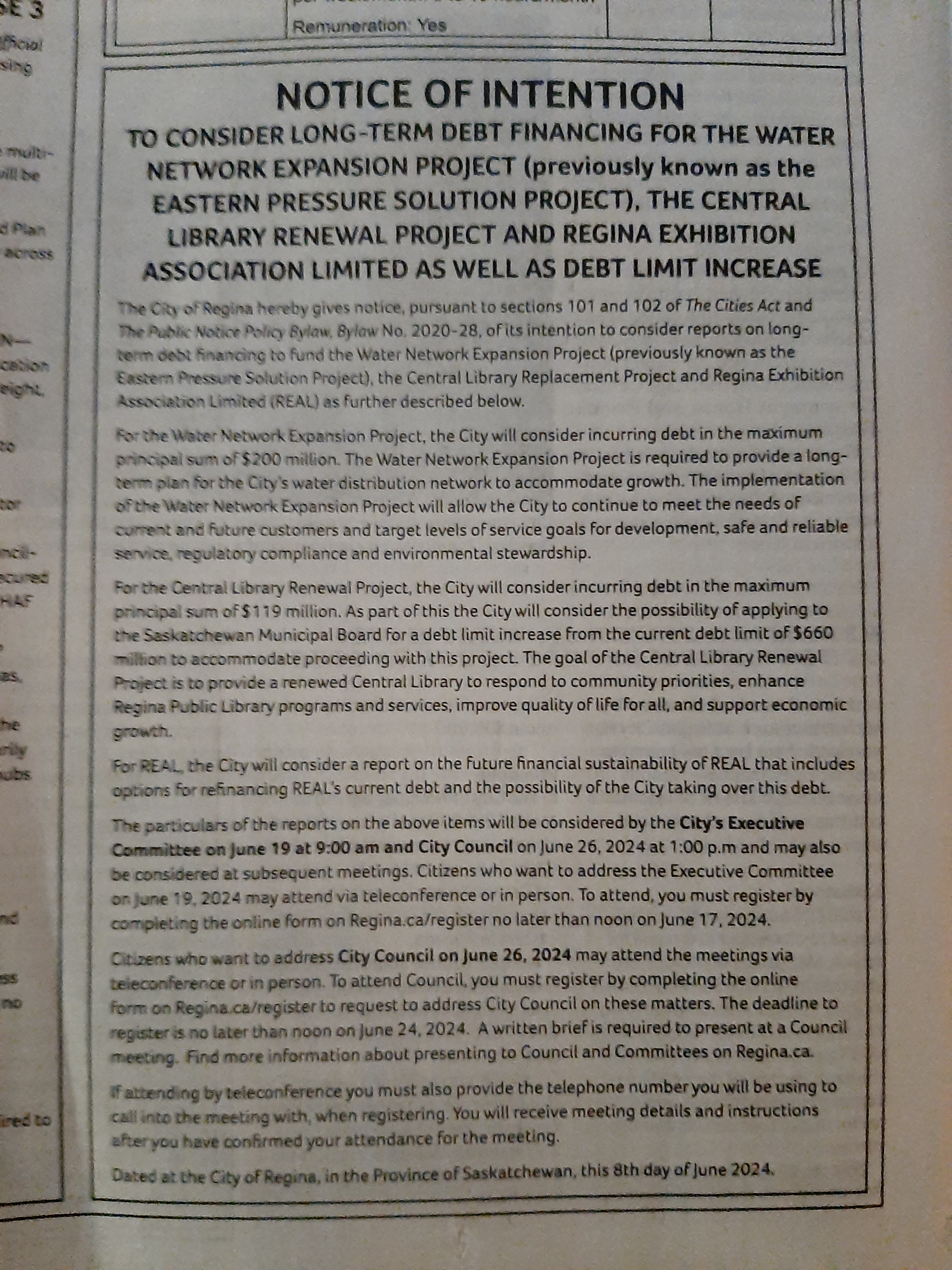 To be “… considered by the City’s Executive Committee on June 19 at 9:00 am and City Council on June 26, 2024 at 1:00 p.m and may also be considered at subsequent meetings. Citizens who want to address the Executive Committee on June 19, 2024 may attend via teleconference or in person. To attend, you must register by completing the online form on Regina.ca/register no later than noon on June 17, 2024. … Citizens who want to address City Council on June 26, 2024 may attend the meetings via teleconference or in person. To attend Council, you must register by completing the online form on Regina.ca/register to request to address City Council on these matters. The deadline to register is no later than noon on June 24, 2024.  A written brief is required to present at a Council meeting.  Find more information about presenting to Council and Committees on Regina.ca. If attending by teleconference you must also provide the telephone number you will be using to call into the meeting with, when registering. You will receive meeting details and instructions after you have confirmed your attendance for the meeting.”